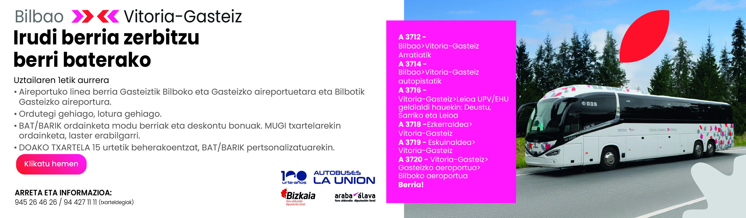 Jakinarazten dugu urriaren 27tik aurrera (astelehena) honako autobus-zerbitzu hauek egingo direla Forondako aireportura joateko (Gasteiz eta Bilboko aireportuak lotzen dituen A 3720 linearen areagotzeak, adibidez), ondorengo koadroan adierazitako egun, egun eta orduetan, Gasteiztik abiatuta (Cadena eta Eleta kaleak) Autobus zerbitzu berezia 2025eko urriaren 25erako, BARAKALDOKO BEC-en (BIZKAIA) IVAP-eko hizkuntza-eskakizunen 2. deialdiko azterketak direla eta www.autobuseslaunion.com eta leihatilan Intermodal Bilbaon eta leihatilan Gasteizko autobus geltokian. Argibideetarako 94 427 11 11 eta 945 26 46 26 telefonoak 2025eko urriaren 15erako deitutako Greba Orokorra dela eta, administrazioak linea desberdinetarako onartu dituen gutxieneko zerbitzuen ordutegiak zehazten dira. Ebazpenak zerbitzu programatuen gutxieneko zerbitzuen %30a ezartzen du, hurrengo zerbitzuak onartuz: Gutxieneko zerbitzuak: Aiarako 14/15/16 lineak- Sakatu hemen Gutxieneko zerbitzuak: L 18 eta L 19 lineak, Durango eta Miranda – Sakatu hemen Informazio gehiago nahi izanez gero,Azken Berriak