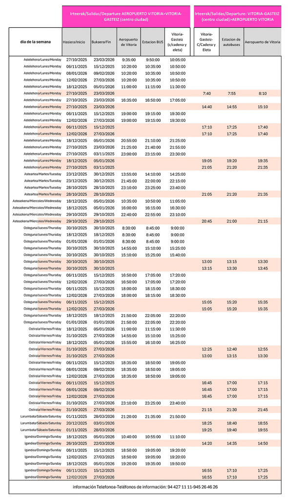 A partir del lunes 27 de octubre se realizarán los siguientes servicios de autobús con destino Aeropuerto de Foronda (como intensificaciones a la línea A 3720 que une los aeropuertos de Vitoria y Bilbao) en los días, fechas y horas indicados en el cuadro siguiente, con origen Vitoria-Gasteiz ciudad (calle Cadena y Eleta).